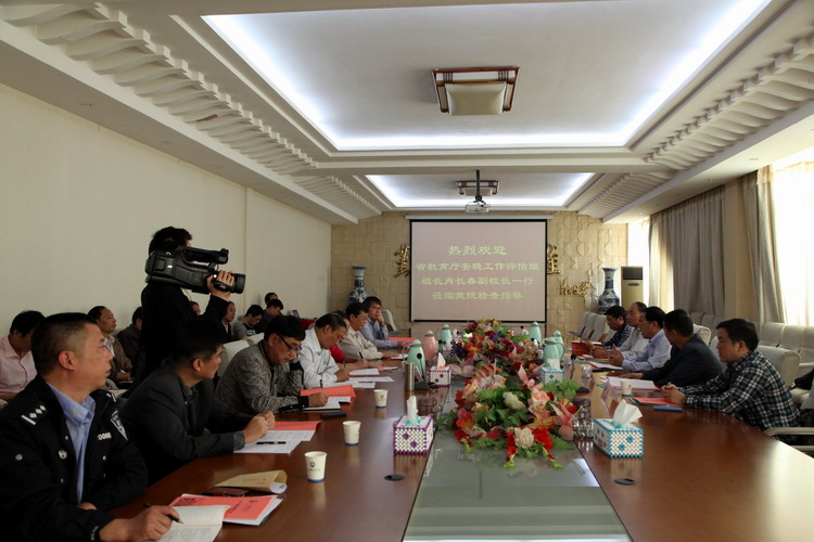高建国副书记向考评组汇报了我校2014年安全稳定工作。他说,一年来,我校深入学习贯彻落实党的十八大、十八届三中全会和习近平总书记系列讲话精神,按照省委教育工委、省教育厅年度部署,坚持安全第一、预防为主,标本兼治的方针,生化平安校园建设,持续净化校园周边环境,确保了校园和谐稳定。他从“强化机制建设”、“强化源头预防”、“强化重点防控”、“强化联防联控”等四方面以及学校当前存在的几个问题进行了分析汇报。